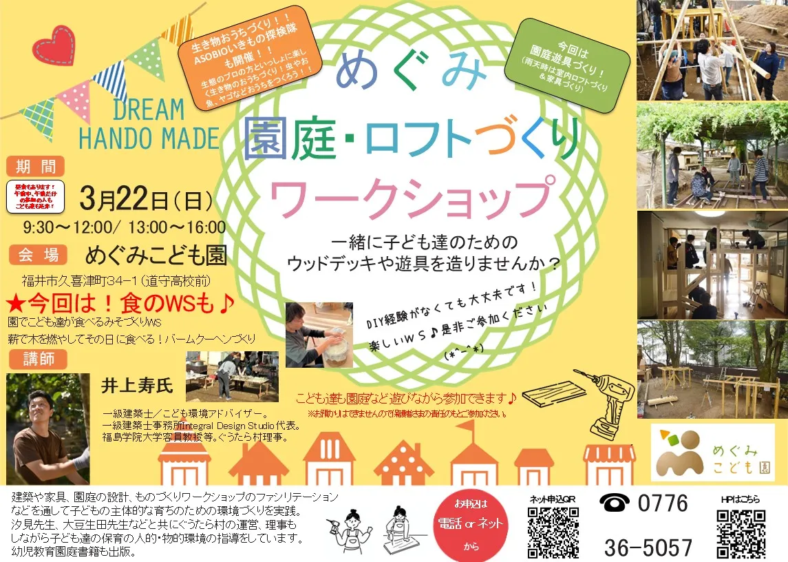 | 事項 | ※DIYの経験なども不要です。是非、お気軽にご参加ください(*^-^*)みんなで創った園庭で遊ぶのは楽しいですよ♪ |