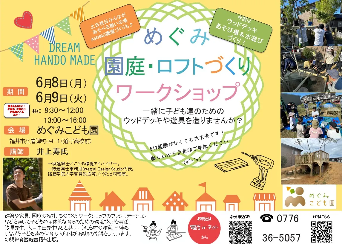 | 事項 | ※DIYの経験なども不要です。是非、お気軽にご参加ください(*^-^*)みんなで創った園庭で遊ぶのは楽しいですよ♪ |